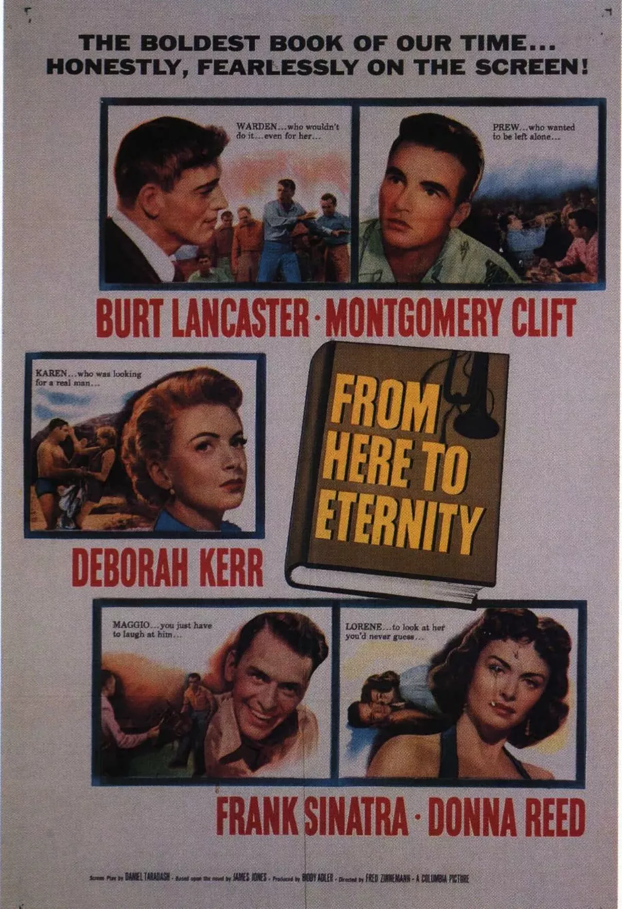 The scene is Schofield Army Barracks in Honolulu, in the languid days before the attack on Pearl Harbor, where James Jones' acclaimed war novel From Here to Eternity brought the aspirations and frustrations of several people sharply into focus. Sergeant Milt Warden (Burt Lancaster) enters into an affair with Karen (Deborah Kerr), the wife of his commanding officer. Private Robert E. Lee Prew Prewitt (Montgomery Clift) is a loner who lives by his own code of ethics and communicates better with his bugle than he does with words. Prew's best friend is wisecracking Maggio (Frank Sinatra, in an Oscar-winning performance that revived his flagging career), who has been targeted for persecution by sadistic stockade sergeant Fatso Judson (Ernest Borgnine). Rounding out the principals is Alma Lorene (Donna Reed), a hostess at the euphemistically named whorehouse The New Congress Club. All these melodramatic joys and sufferings are swept away by the Japanese attack on the morning of December 7. No words could do justice to the film's most famous scene: the nocturnal romantic rendezvous on the beach, with Burt Lancaster's and Deborah Kerr's bodies intertwining as the waves crash over them. If you're able to take your eyes off the principals for a moment or two, keep an eye out for George Reeves; his supporting role was shaved down when, during previews, audiences yelled There's Superman! and began to laugh. From Here to Eternity won eight Academy Awards, including Best Picture, Best Director, Best Adapted Screenplay, and supporting awards to Sinatra and Reed.~ Hal Erickson, All Movie Guide