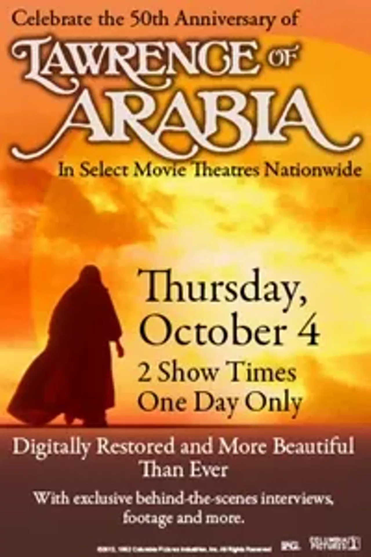 On Thursday, October 4th, NCM Fathom Events and Sony Pictures Entertainment present a one-time only movie theater showing of one of the most popular and influential films in the history of cinema with Lawrence of Arabia 50th Anniversary Event: Digitally Restored at 7:00 PM local time, with special matinees in select theaters. The Director's Cut of the film was meticulously restored by Sony Pictures Entertainment in 4K at Sony Pictures' Colorworks from the original 65mm negative. The event will also include special behind the scenes extras, footage and interviews.