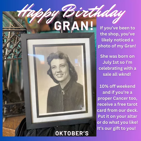 In celebration of my Gran’s birthday, we are having a 10% of all wknd sale! We have Ana in with tarot, astrology, Lenormand and palmistry readings all wknd too! Bring your favorite Gran (or anyone you like, really) and stop in for all your witchcraft needs! New crystals, herbs, candles, incense, books, journals, handmade oils, handmade jewelry, greeting cards, enamel pins and so much more! Stop in for a spell and see your favorite neighborhood witches! See you soon!