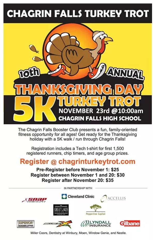 The Chagrin Falls Booster Club is hosting their 10th Annual Thanksgiving Day Turkey Trot. A fun, family-oriented fitness opportunity for all ages! Get ready for the Thanksgiving Holiday with a 5K run/walk through beautiful Chagrin Falls, Ohio! Registration includes a Tech T-shirt for first 1,500 registered runners, chip timers, and age group prizes.