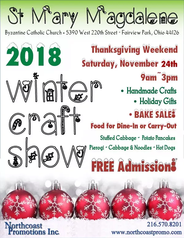 11th Annual St. Mary Magdalene Byzantine Catholic Church Craft Show. November 24, 2018 9am-3pm Free Admission! Fall & Christmas Holiday Shopping – 90 local Handmade Artist & Crafter/local businesses featuring fashion apparel & home décor for the upcoming holidays. Baked Goods & Good European Ethnic Foods made by the Church for eat in or take out benefiting the church. Raffles for Prizes too. Shop Local Saturday.