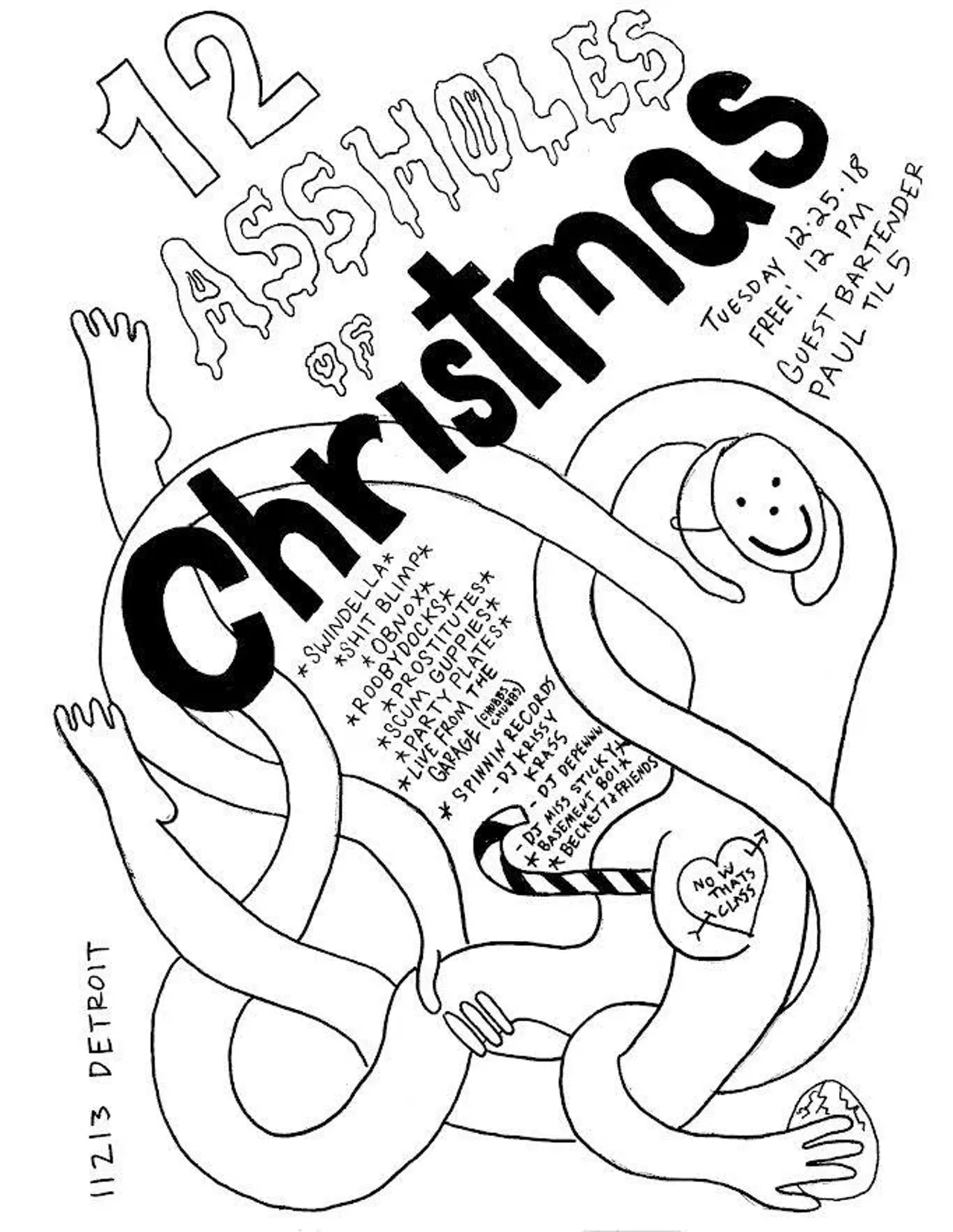 It's a tradition that, at noon on Christmas day, the punk-rock club Now That's Class opens its doors to welcome "those who don't have anywhere to go or don't wanna go anywhere" for an event dubbed 12 Assholes of Christmas. From noon to 3 p.m. today, the bar will offer specials on select Great Lakes beers, selling them for only $1. The price goes up by increments as the day goes on: the brews will cost you $2 from 3 to 6 p.m., and $3 from 6 to 9. Acts such as Blimp, Obnox, Roobydocks, Swindella, Prostitutes, Scum Guppies, Party Plates, Live from the Garage, Basement Boi, Beckett & Friends, DJ Krissy Krass, DJ Sadie and DJ Depeww will provide the tunes. It's free, but bring along something for the potluck dinner. (Niesel)