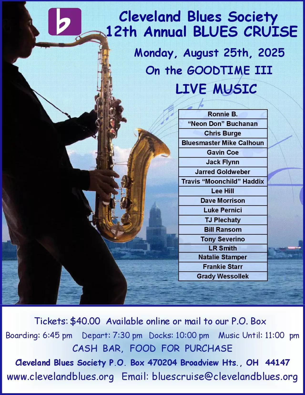 Tickets available at the https://clevelandblues.company.site/2025-Blues-Cruise.The Cleveland Blues Society is a non-profit organization whose mission is to promote awareness and appreciation for the blues. Through our alliance, we endeavor to provide more opportunities for fans to see quality local and national blues artists.