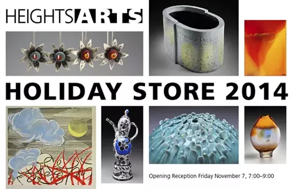 The Heights Arts Holiday Store opens with a members’ preview on Friday, November 7, 6:00-7:00 p.m., followed by an open reception at 7:00-9:00 p.m. The store runs through December 30, with expanded evening and Sunday hours.