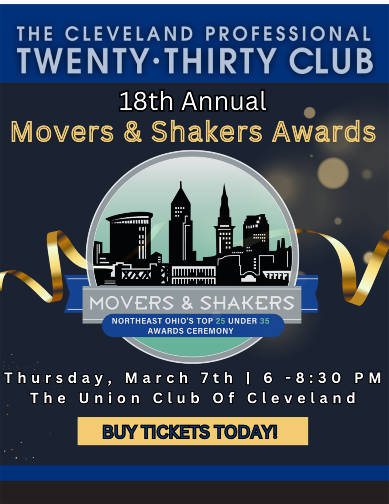 The Cleveland Professional 20/30 Club is proud to present the 18th Annual Movers & Shakers Awards. This ceremony gives the opportunity to celebrate and network with Cleveland's rising stars!