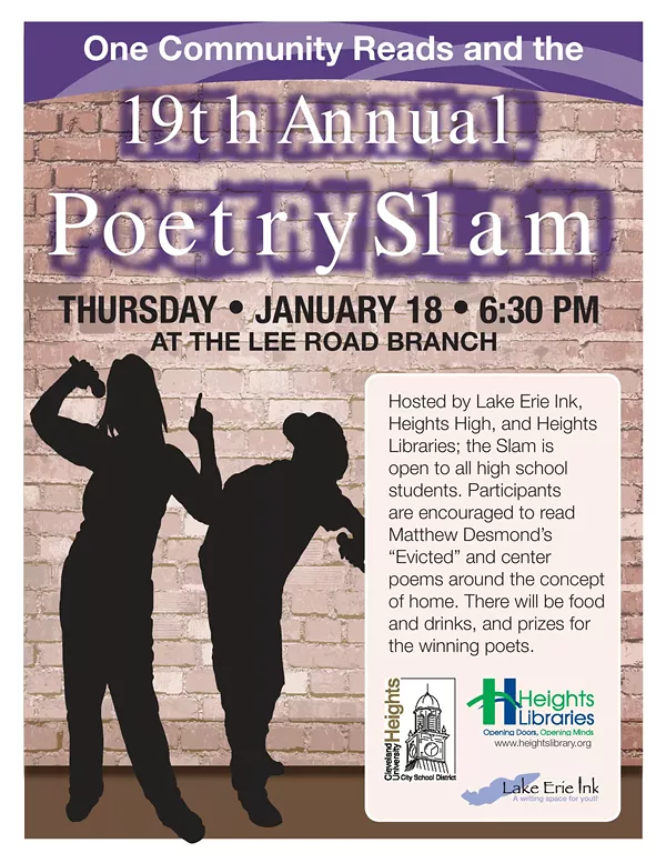 Hosted by Lake Erie Ink, Heights High, and Heights Libraries; the Slam is open to all high school students. Participants are encouraged to read Matthew Desmond’s “Evicted” and center poems around the concept of home. There will be food and drinks, and prizes for the winning poets.