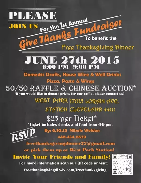 Please join us for the 1st Annual Give Thanks Fundraiser to benefit the Free Thanksgiving Dinner! Meet us on June 27th 2015 at West Park Station to enjoy some great food and drinks! Along with the event its self we will be having a 50/50 raffle and Chinese Auction! Tickets will be $25.00 per person and include Domestic Drafts, Well Drinks, and House Wine as well as Pizza, Pasta, and Wings! Help us make this event a success! Only with your help can we continue to give thanks by giving to others!!