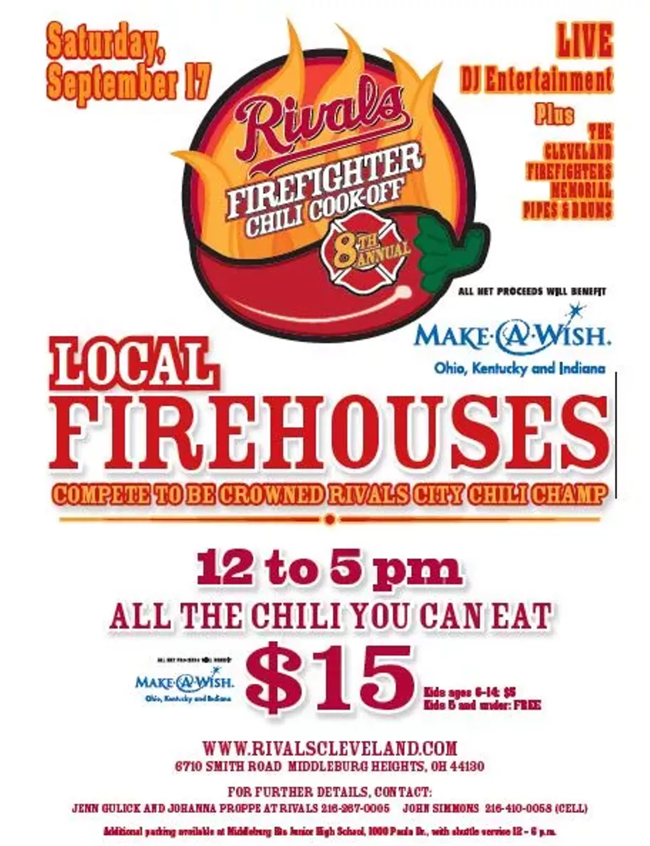 A host of Cleveland area fire departments will pit their culinary skills against each other at Rivals Sports Grille on September 17, 2016 from noon until 5 PM to raise funds for the Make-A-Wish Foundation. Firefighters from roughly two-dozen firehouses vying for the title of Rivals City Chili Champ. DJ'd music on the patio will be provided by Burning River Entertainment Group. You can be part of helping these dreams come true! Come join your friends, neighbors, and local fire departments as we crown the firehouse chili champ, and help grant a special wish for a special child.