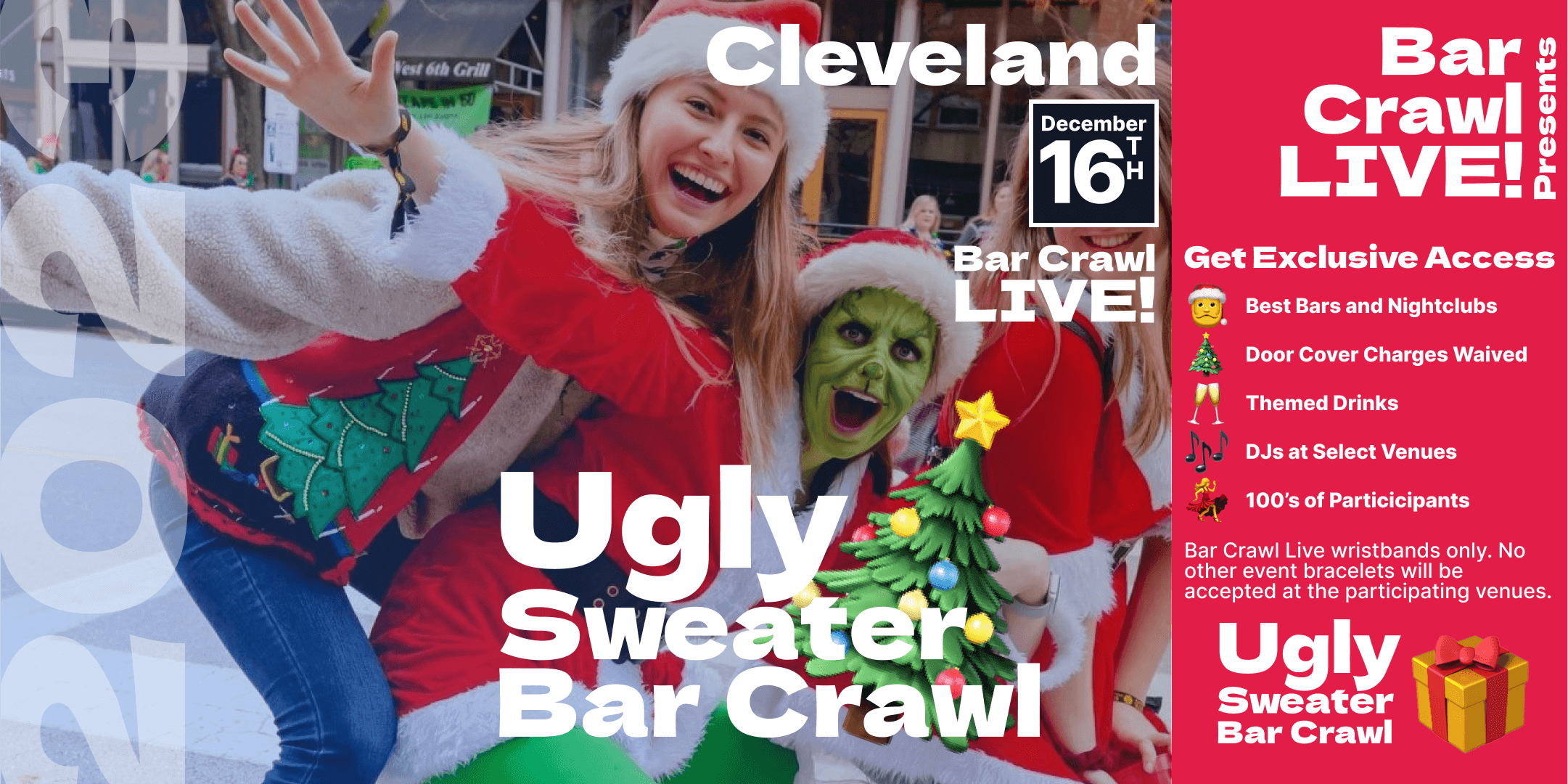 It's the most wonderful time of the year, and what better way to celebrate than by donning your quirkiest, coziest, and downright ugliest sweaters? Bar Crawl LIVE! is thrilled to announce the return of the legendary Ugly Sweater Bar Crawl in Cleveland! Get ready to sleigh the night with us on a frosty adventure that'll warm your spirits and tickle your funny bone.