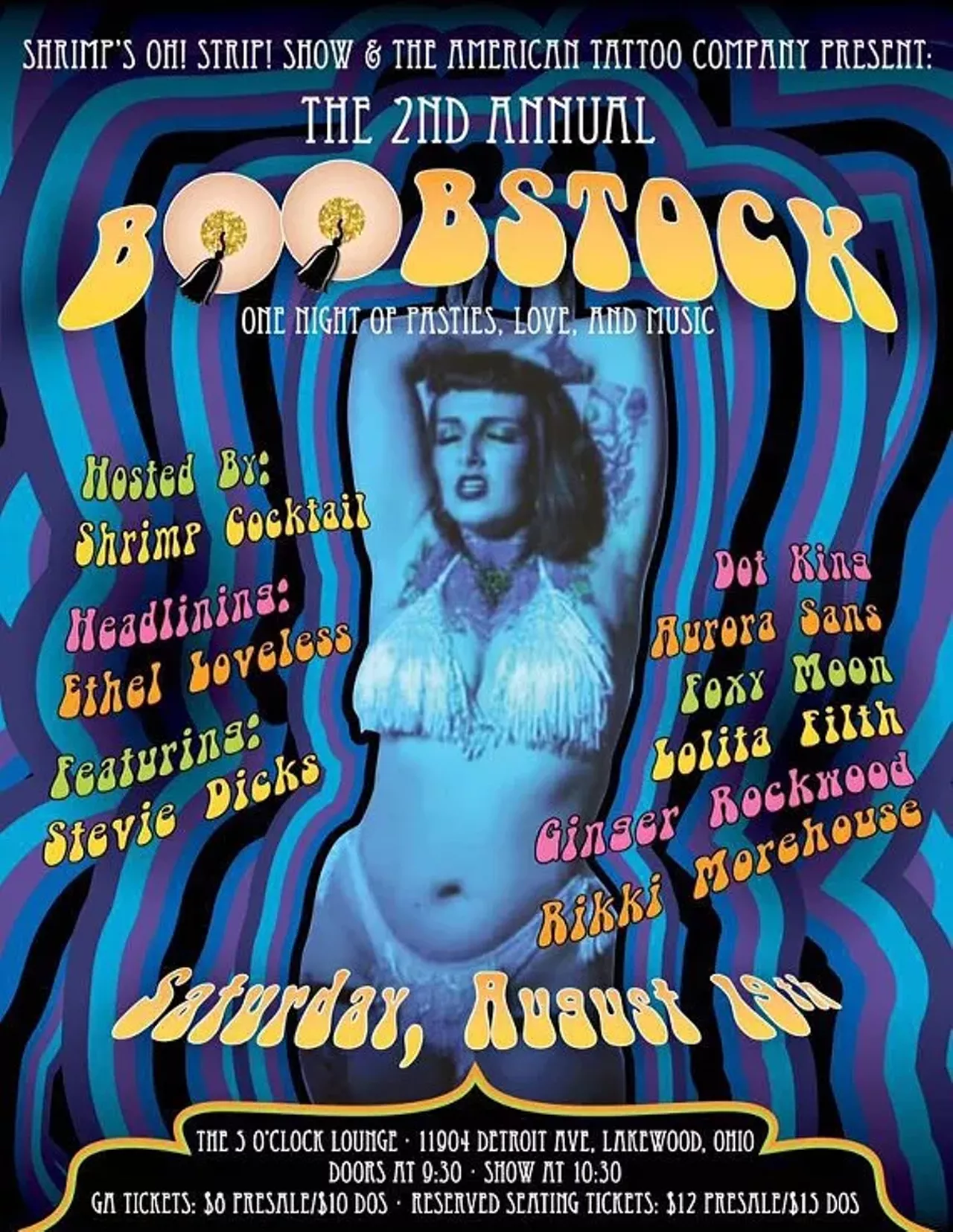 Shrimp's Oh Strip Show and The American Tattoo Company present The 2nd Annual Boobstock: One Night of Pasties, Love, and Music.