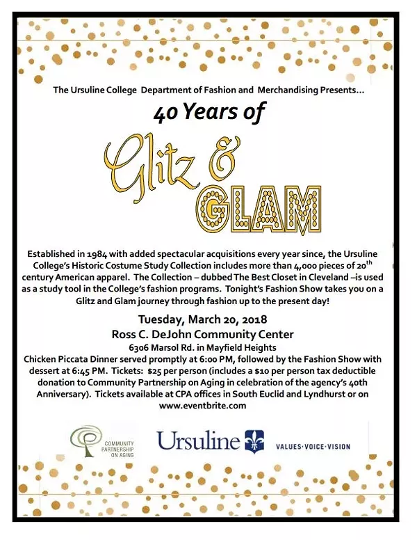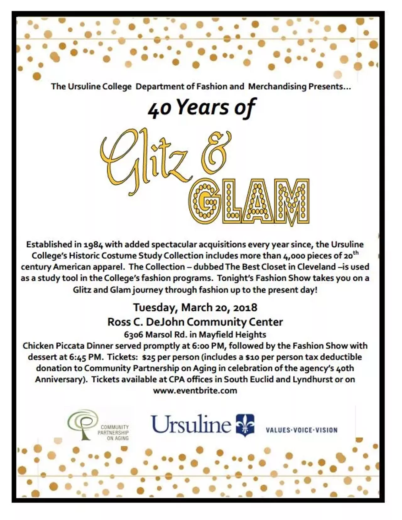Join Community Partnership on Aging and Ursuline College's Fashion and Merchandising Department for "40 Years of Glitz & Glam" on Tuesday, March 20, 2018 at Ross DeJohn Community Center.