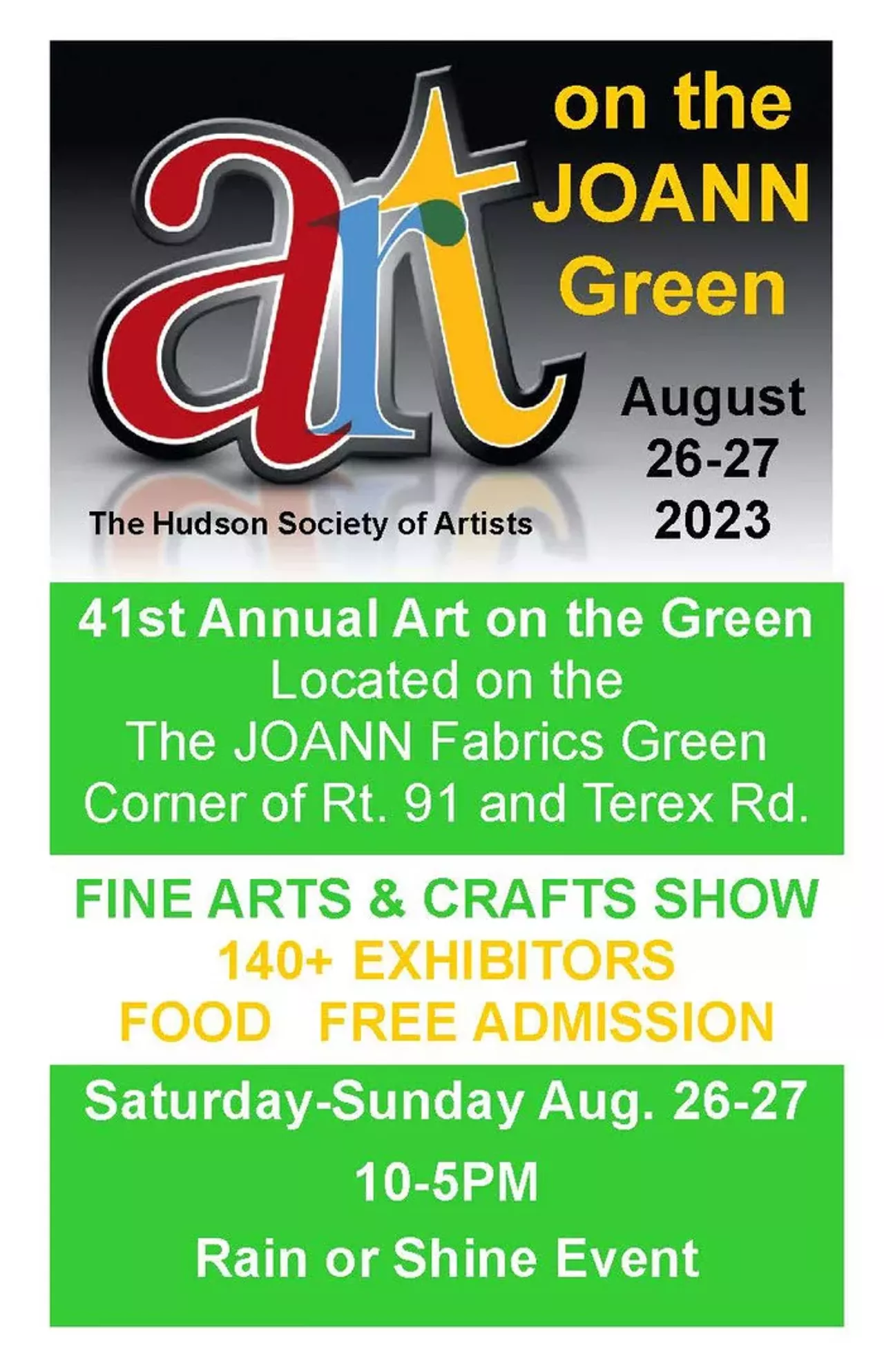 The Hudson Society of Artists Will Present the 41st Annual Art on the Green Saturday and Sunday August 26-27 at Our New Location on the JOANN Green at the Corner of Terex Rd. and Rt. 91 in Hudson, OH.