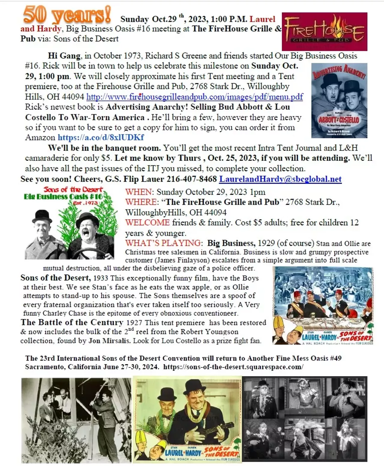 50 Years! Sunday Oct.29 th, 2023, 1:00 P.M. Laurel and Hardy, Big Business Oasis #16 meeting at The FireHouse Grille & Pub via: Sons of the Desert