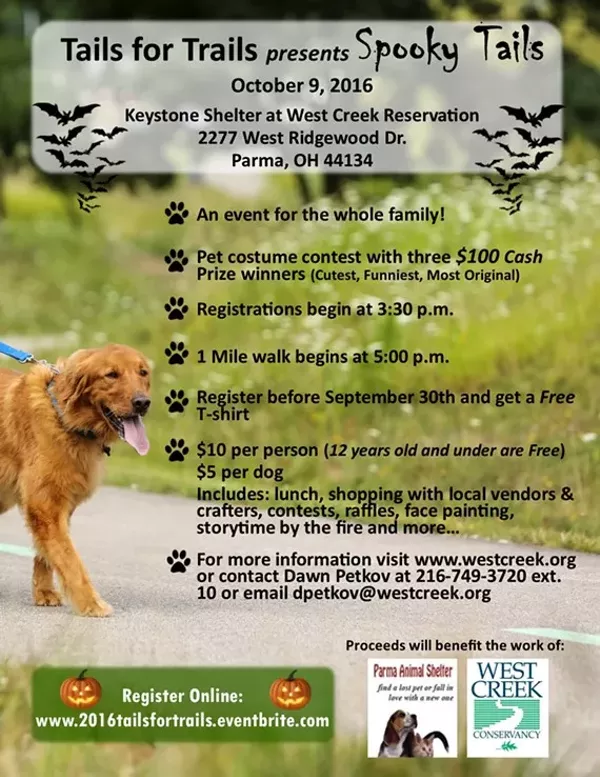 West Creek Conservancy and Parma Animal Shelter will co-host the 5th Annual Tails for Trails Dog Walk at the Keystone Shelter at West Creek Reservation. We invite you to come check out this fun-filled afternoon with your furry friends. The event includes: lunch, raffles, hike, games, dog costume contest with cash prizes, storyteller by the fire with donuts & cider and more. Everyone is welcome to participate with or without a dog. Special raffle for those that seek pledges. Visit westcreek.org for more info.