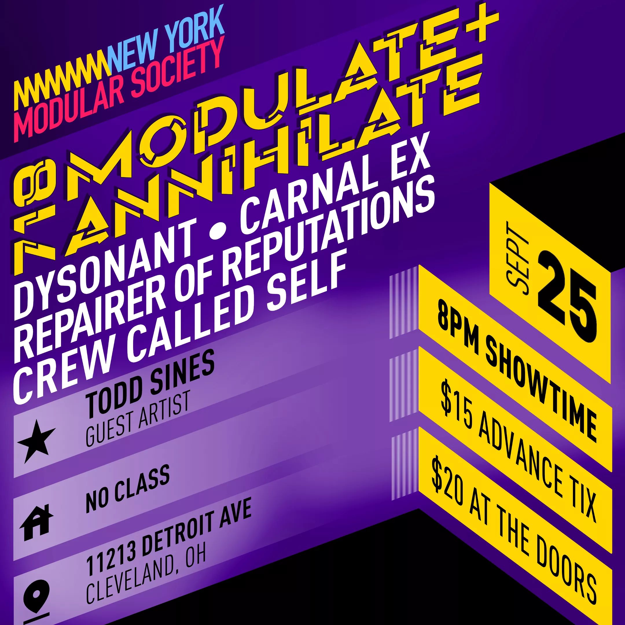 Live Modular Synth Electronic Music. New York Modular Society is playing live in Cleveland for one night only! Come through to see four Brooklyn based beasts of beats & bleeps modulate and annihilate the sound system. Featuring: Carnal Ex, Crew Called Self, Repairer of Reputations & Dysonant. With Special Guest: Todd Sines.