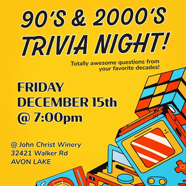 Get ready to test your knowledge of all things 90's and 2000's at the ultimate TRIVIA NIGHT, happening with host Kelly Kaz Entertainment! Gather your friends and get ready to reminisce about the good old days while sipping on delicious wines! Don't miss out on this blast from the past event!