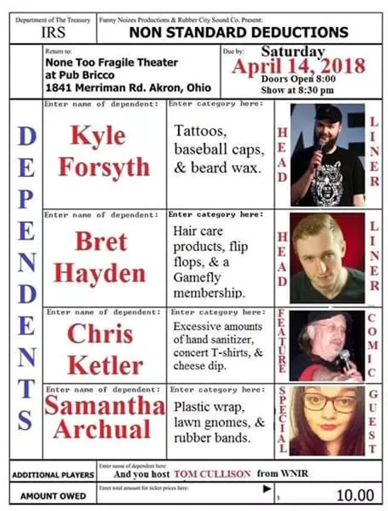 Funny Noizes Productions in conjunction with Rubber City Sound Co. are honored to bring to The None Too Fragile theater inside Pub Bricco a Tax Relief Comedy Show starring Kyle Forsyth & Bret Hayden, featuring Chris Ketler, introducing Samantha Archual, & a very special guest.