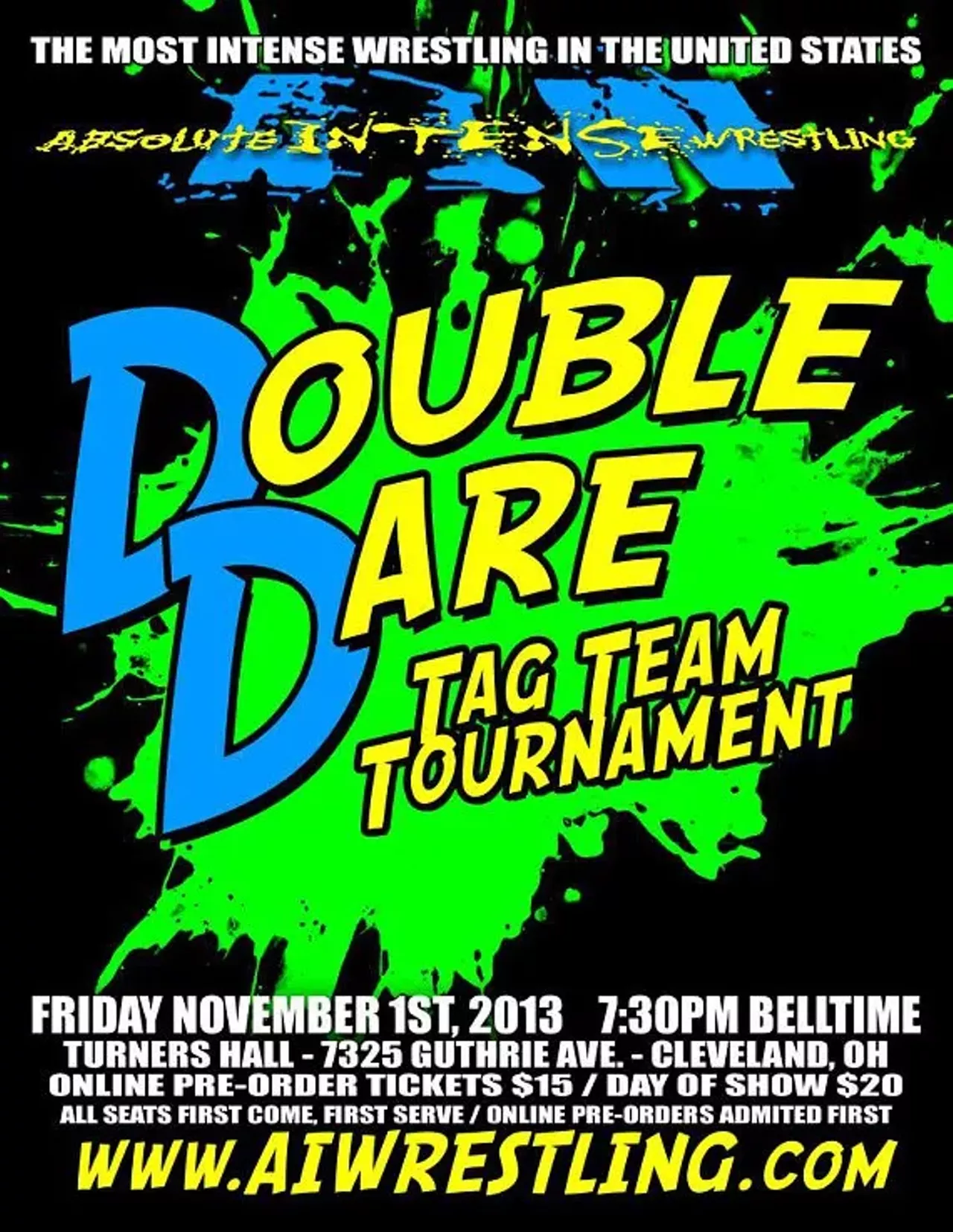 On Friday night, November 1st, Absolute Intense Wrestling (AIW) will return to Cleveland's legendary Turners Hall (7325 Guthrie Ave, 44102) to present Double Dare. Double Dare will feature AIW's first ever 8-tag team single elimination tournament. Don't miss this historic event.