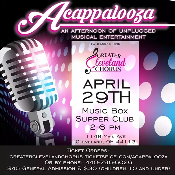 Enjoy great food, raffles, a waterfront view and live music! Acappalooza: an afternoon of unplugged musical entertainment, at the Music Box Supper Club on April 29, 2018 will showcase a cappella arrangements of songs by artists such as the Beatles, Queen, the Eurythmics, Stevie Wonder, Toto, Frank Sinatra, Paul Simon, Barbra Streisand, Justin Timberlake, and many more. In addition to a cappella performances by the Greater Cleveland Chorus, Unfinished Business, TGIF, Wing It, and Intrinsic, the program will also include acoustic performances by Cleveland artists Becky Boyd, Pelcone & Co., the Mike Binder & Priscilla Acoustic Duo, and Guy Snowdon.