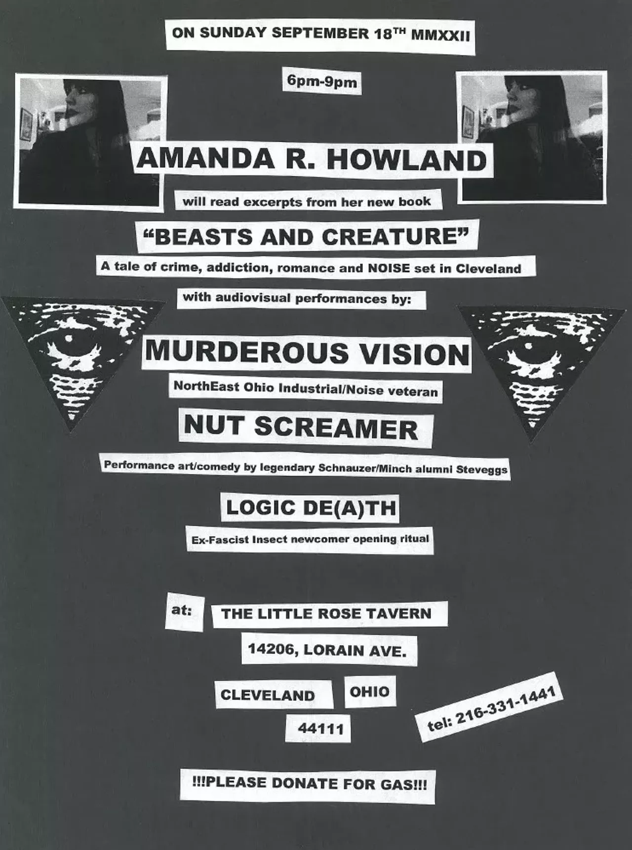 AMANDA R. HOWAND will read excerpts from her new novel "BEASTS AND CREATURE" , a tale of crime, addiction, romance and NOISE set in Cleveland with audiovisual performances by: