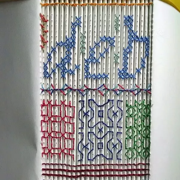 In this workshop, participants will explore the intersection of sewn bindings and the possibilities of expanding embroidery techniques onto the spine of a book. The workshop will begin by making simple adaptations of more traditional bindings, using weaving and braiding, and modifying a link stitch to create an embroidered sampler-style binding. Participants will expand their repertoire to create on the embroidered spine sampler by adding patterns derived from Elizabethan Blackwork embroidery and other more traditional styles.
