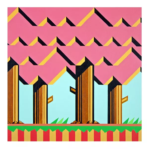 Art on Madison is pleased to present Castles in the Air, a solo exhibition by Cleveland based painter, Timothy Gaewsky. Castles in the Air explores Gaewsky’s personal nostalgia for the retro 8-bit video games that he played growing up in the 1980’s and early ’90’s. Gaewsky’s colorful and whimsical paintings appropriate and manipulate design elements and visual cues from some of his favorite games. Each painting, in essence, becomes a quasi-screenshot of a different level of an expansive video game he is creating for himself and the viewer.