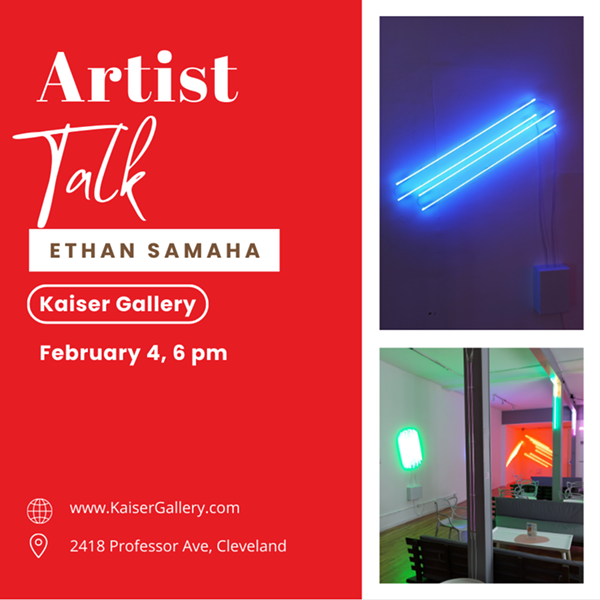 Join Kaiser Gallery for a special Artist Talk with Ethan Samaha and see his solo exhibit Lateral Perspective at Kaiser Gallery! 'Lateral perspective' explores perception and perspective using wall based neon designs. The works question what’s in-front, behind, top, and bottom. Changing the viewer’s perspective as they traverse the space. Exploring the relations of color and form, these designs will range from monochrome to saturated, and will display subtle color shifts.