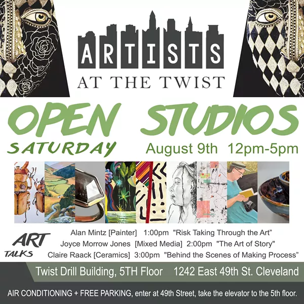 There is free parking, free admission, elevators, and central air-conditioning. Artists at the Twist is located on the 5th floor of the Cleveland Twist Drill Bldg., 1242 E.49th, Cleveland.