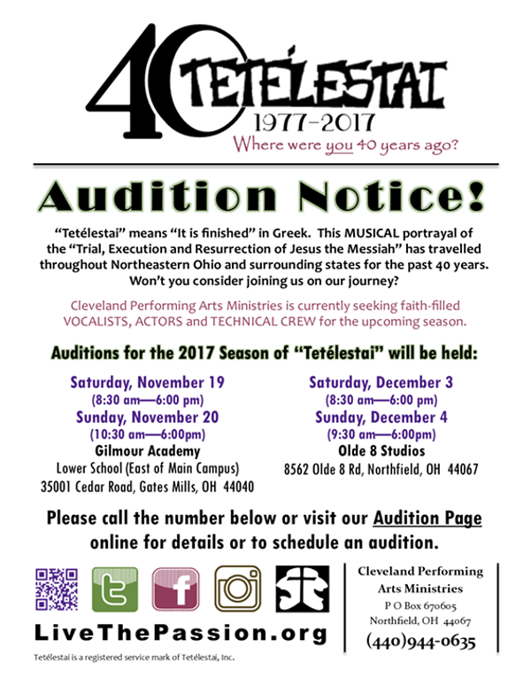 Auditions for cast & crew for the musical passion play "Tetélestai" will be held at Gilmour Academy Lower School in Gates Mills on Saturday & Sunday, November 19th and 20th at Gilmour Academy Lower School in Gates Mills and on Saturday & Sunday, December 3rd and 4th at Olde 8 Studios in Northfield. Times, information and details on how to schedule are available online at LiveThePassion.org or by calling 440-944-0635. Tetélestai is a registered service mark of Tetélestai, Inc.
