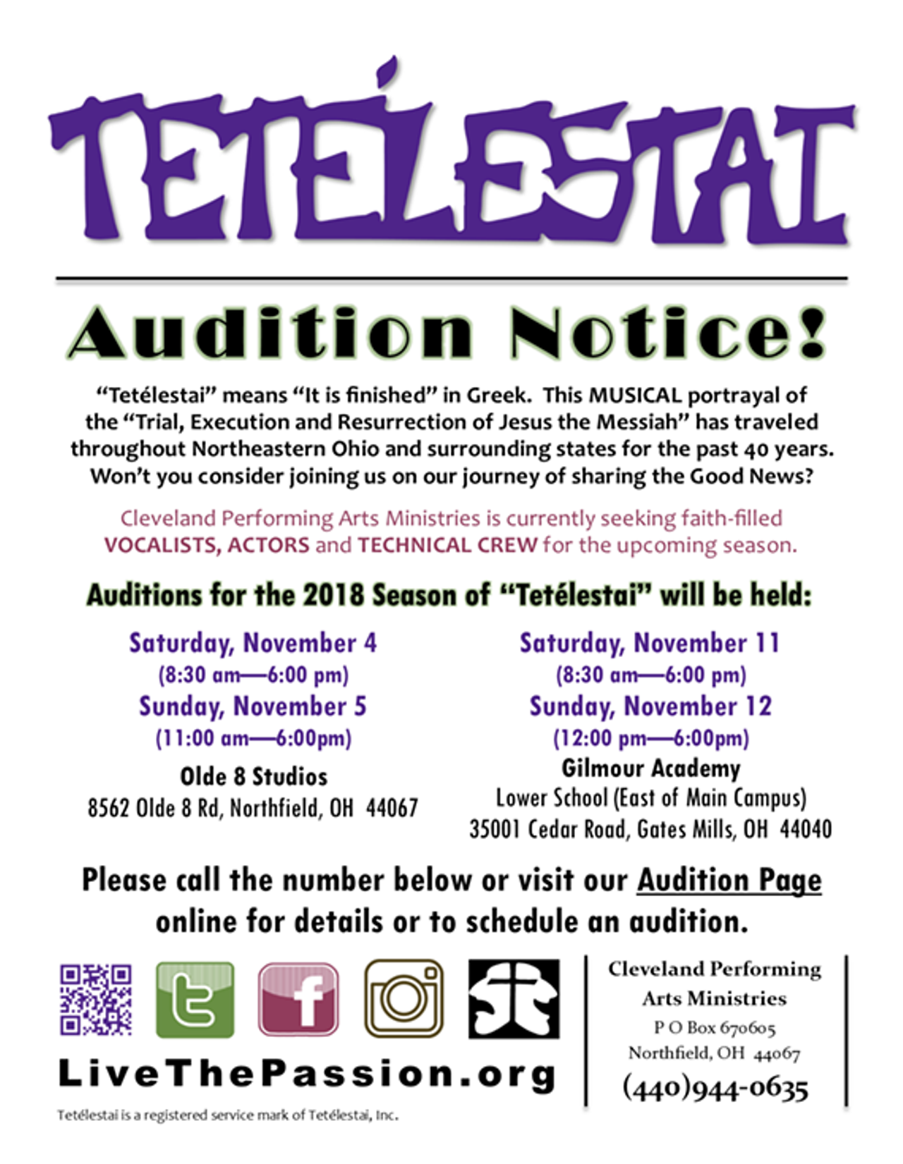Auditions for cast & crew for the musical passion play "Tetelestai" will be held Nov 4th & 5th at Olde 8 Studio and Novr 11th & 12th at Gilmour Academy Lower Schools. To obtain the necessary forms and to schedule an audition, please visit our website at LiveThePassion.org or call CPAM at (440)944-0635.