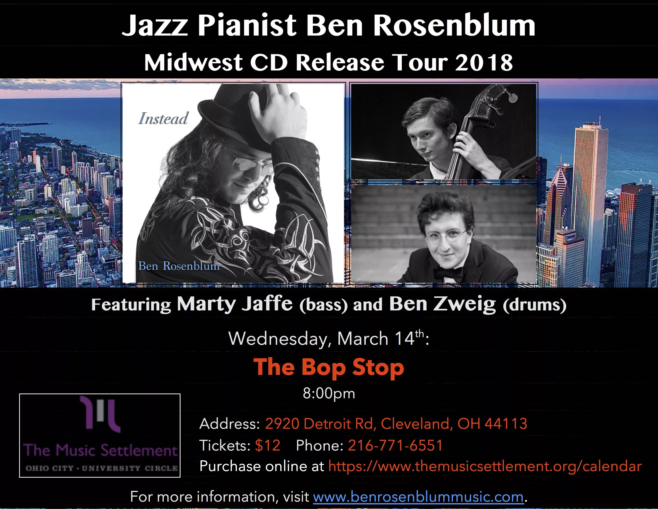 Award-winning New York City jazz pianist Ben Rosenblum plays material from his debut album Instead (4 stars, Downbeat Magazine) at the Bop Stop in Cleveland, featuring the highly regarded Marty Jaffe on bass and Ben Zweig on drums. Described as an "impressive talent" by All About Jazz, Ben was a finalist the 2015 American Jazz Pianist Competition in Melbourne, Florida, and at the 2016 Jacksonville Jazz Piano Competition in Jacksonville, Florida, and has played in the bands of Curtis Lundy, Bobby Watson, TS Monk, Winard Harper, Wayne Escoffery and many others. Visit https://www.themusicsettlement.org/calendar/2018/03/14/ben-rosenblum-trio-bop-stop for more information.