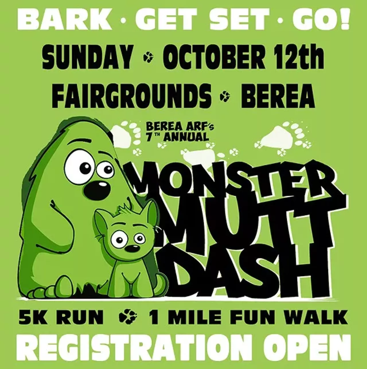 Bark, Get Set, GO! The Monster Mutt Dash is a pet friendly 5k race along with a shorter one-mile Fun Walk for those who prefer a more casual pace. The race/walk starts at 10:00 AM and will be followed by ARF's FREE Howl-O-Ween AfterParty from 11 am till 1pm with vendors, games, raffles, vittles, entertainment, Costume Contest with prizes and MORE! Increase your impact, raise Mutt Bucks, earn pawsome incentive prizes and help MORE deserving animals! Run to BereaAnimalRescue.com for the scoop!