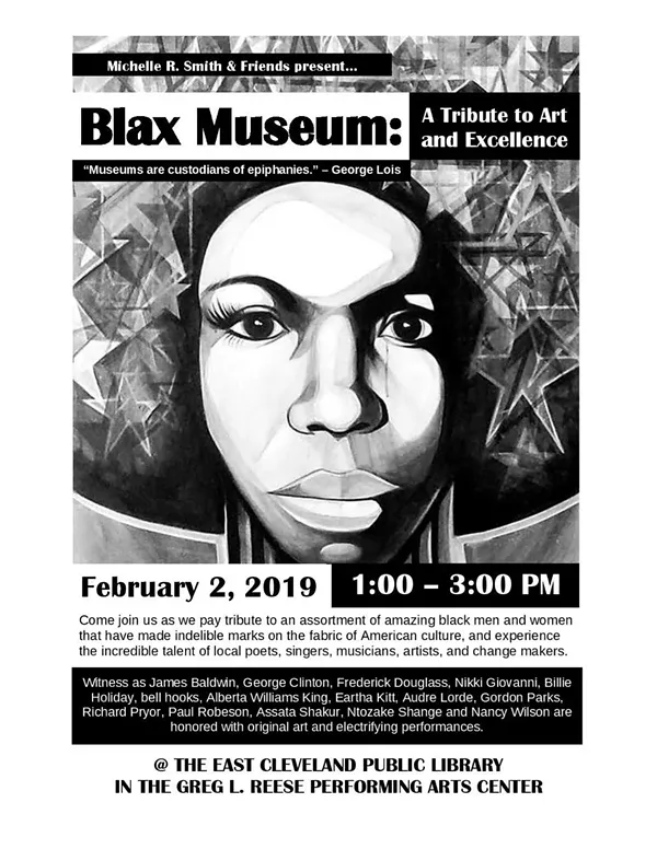 A poet, blogger, educator and cultural facilitator, Michelle R. Smith has recently been a featured poet and panelist at the Coast Line Poetry Series at the Lakewood Public Library, the Ekphrastic Poetry Invitational at the Cleveland Museum of Art and the Great Lakes' Black Authors Expo and Writers Conference. Today she brings her annual artist showcase, Blax Museum, back to the East Cleveland Public Library. The event will take place from 1 to 3 p.m. in the Greg L. Reese Performing Arts Center. It will feature black artists from Northeast Ohio who'll give original presentations and performances. (Niesel)