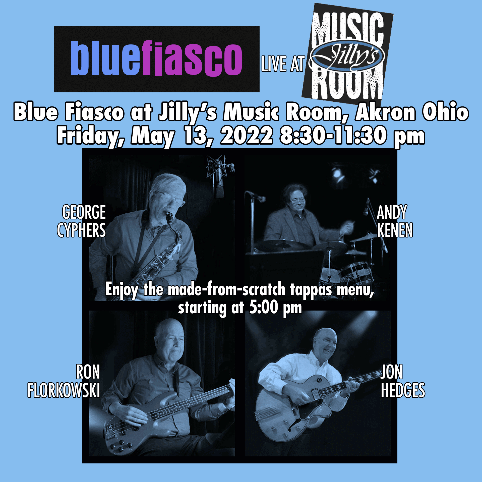 Blue Fiasco is a quartet playing jazz standards and jazz arrangements of 60s-70s-80s classic rock hits from Pink Floyd, The Beatles, Billy Joel, and more. Jilly’s Music Room is in the Northside District of downtown Akron and has a sophisticated atmosphere with great acoustics and great menu. Come early for dinner and stay for the show. The tappas menu is available at 5:00 pm and Blue Fiasco plays at 8:30. We hope to see you there!