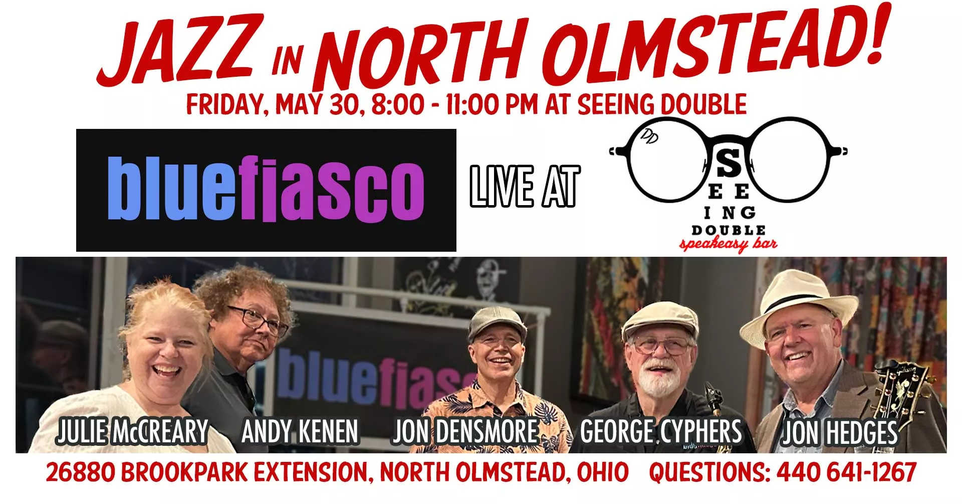 Join Blue Fiasco as they return to the Seeing Double Speakeasy Bar in Cleveland on Friday, May 30, 2025. The group plays a mix of 1960s, 70s, 80s and 90s classic rock and pop hits, re-imagined as jazz, along with some jazz standards. You'll hear The Beatles, U2, The Police, Stevie Wonder, and more. Enjoy craft cocktails and have a fun evening listening to unexpected jazz.
