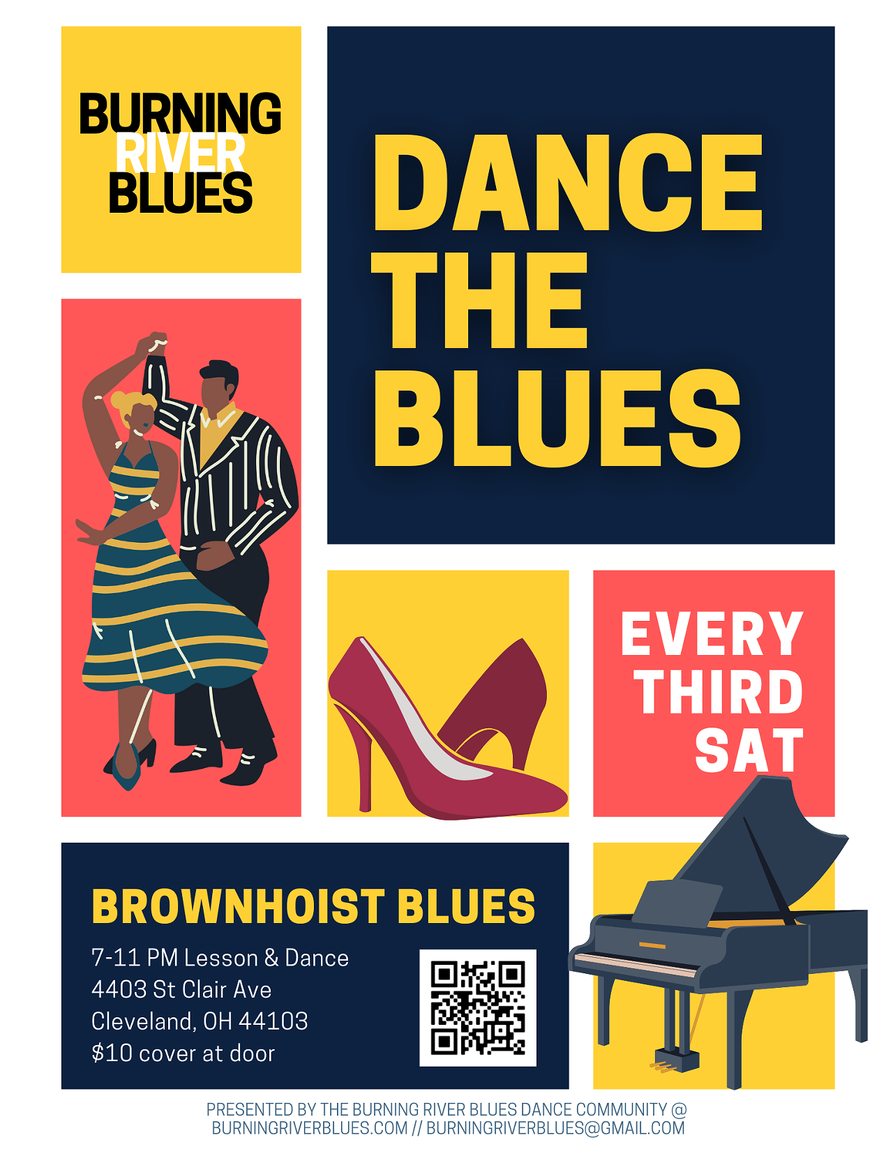 Join us for our monthly 3rd Saturday Blues Dance Party at the historic Brownhoist Ballroom! At 7pm a beginner friendly blues class will be taught by our blues dance instructor! After the lesson from 8-11pm a DJ will play blues music and we will dance the night away! Please follow us on Facebook at Burning River Blues.