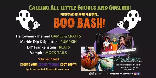 Come on in for our 3rd annual Boo Bash at Pinspiration!! Each guest will make Halloween themed CRAFTS, splatter a PUMPKIN, play GAMES, spooky FACE PAINTING, make a DIY Frankenstein TREAT, and enjoy a Vampire MOCK-TAIL!