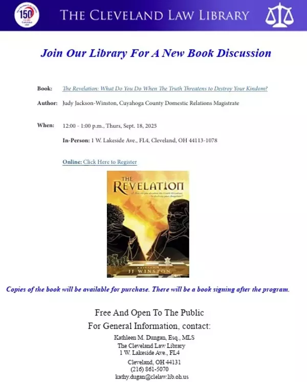 Join the Cleveland Law Library as we welcome Cuyahoga County Domestic Relations Magistrate Judy Jackson-Winston in person at 12:00 p.m. on September 18, 2025 to discuss her latest book entitled The Revelation. The third in a trilogy of the Magistrate’s books surrounding the lives of 2 married lawyers named Juliette and Grandville, The Revelation is a gripping emotional and deeply moving story of resilience, redemption, and unbreakable bonds of love. This story is filled with heartbreak, setbacks, and devastating mental health issues, and Juliette finds herself fighting for her family, being the glue that holds everything together.