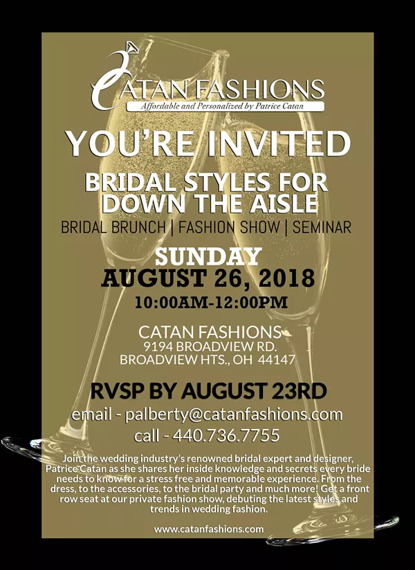 Join the wedding industry’s renowned bridal expert and designer, Patrice Catan as she shares her inside knowledge and secrets every bride needs to know for a stress-free and memorable experience. From the dress, to the accessories, to the bridal party and much more! Get a front row seat at our private fashion show, debuting the latest styles and trends in wedding fashion.