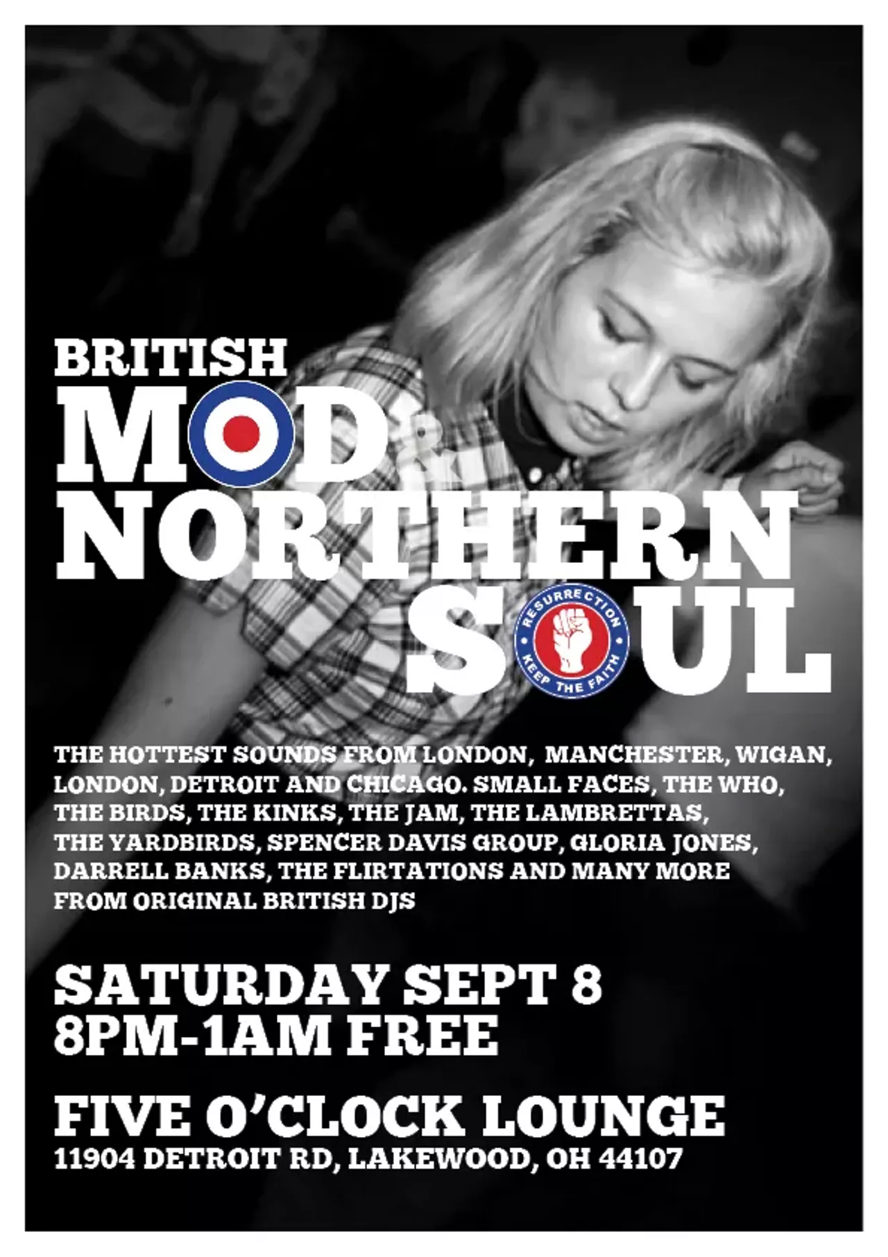 THE HOTTEST SOUNDS FROM LONDON, MANCHESTER, WIGAN, DETROIT AND CHICAGO. MUSIC FROM SMALL FACES, THE WHO, THE BIRDS, THE KINKS, THE JAM, THE LAMBRETTAS, THE YARDBIRDS, SPENCER DAVIS GROUP, GLORIA JONES, DARRELL BANKS, THE FLIRTATIONS AND MANY MORE PLAYED BY ORIGINAL BRITISH DJS.