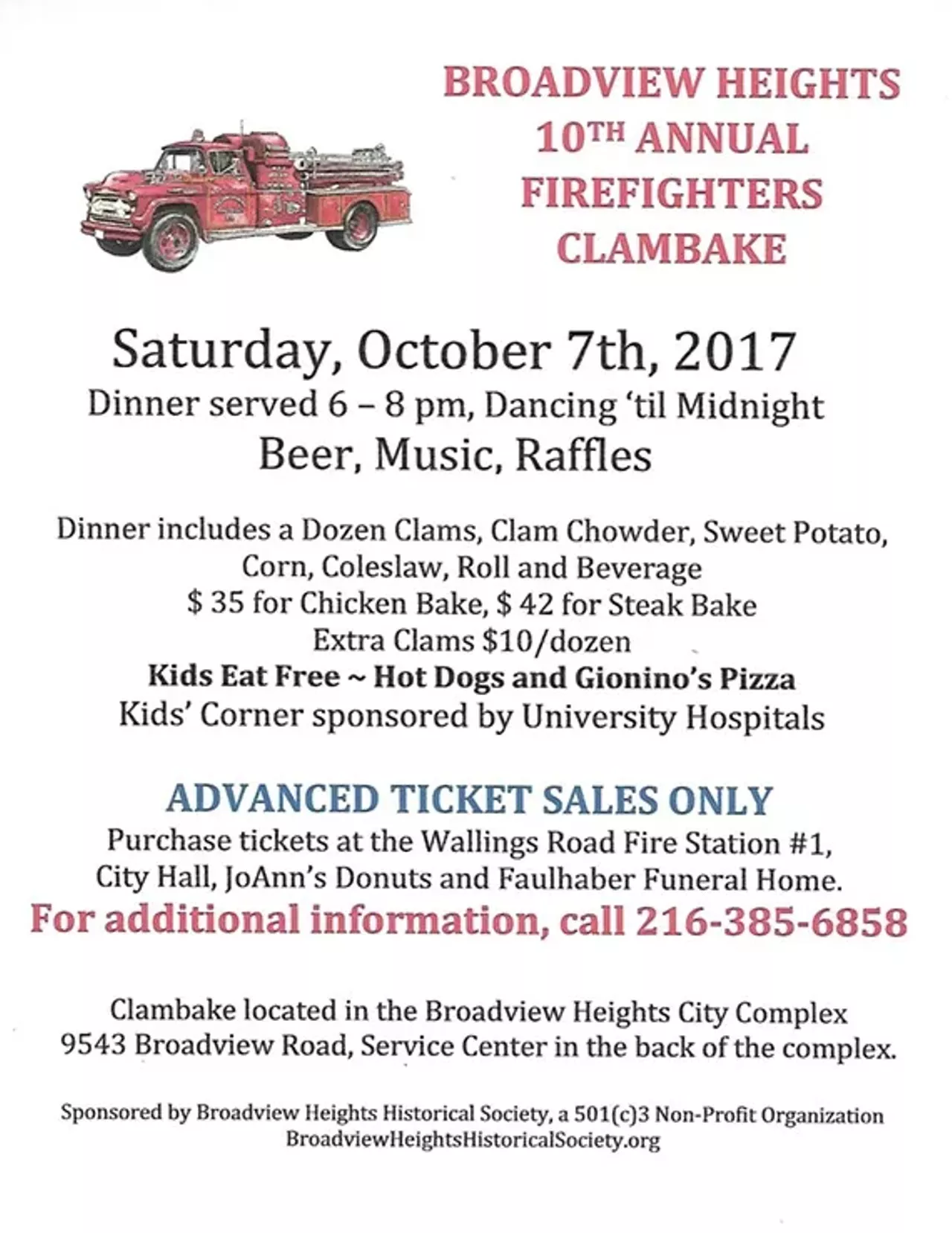 10th Annual Broadview Heights Firefighters Clambake- October 7, 2017, Dinner from 6 to 8PM (Dancing till Midnight!) Location is 9543 Broadview Road - Broadview Heights Service Center - at the Rear of the City Hall Complex. Advanced Ticket Sales Only – tickets may be purchased at City Hall in Council Clerk’s office, Wallings Rd. Fire Station #1, JoAnn's Donuts & Faulhaber Funeral Home. Tickets: $35.00 per person for Chicken Bake - $42.00 per person for Steak Bake – Extra Clams - $10.00 per dozen. FREE HOT DOGS AND GIONINO'S PIZZA FOR THE KIDS! Beer-Raffles-Music and more!