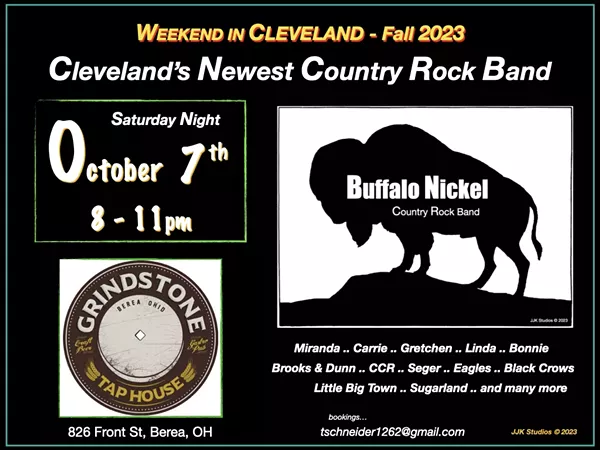 As part of the Weekend in Cleveland Fall 2023 series - Cleveland's Newest Country Rock Band "Buffalo Nickel" will make their first appearance at the Grindstone Taphouse in Berea on Saturday October 7th / Tammy Schneider - Vocals / Bob Mosher - Guitars / Nate Rowell - Bass / Joe Rieg - Drums