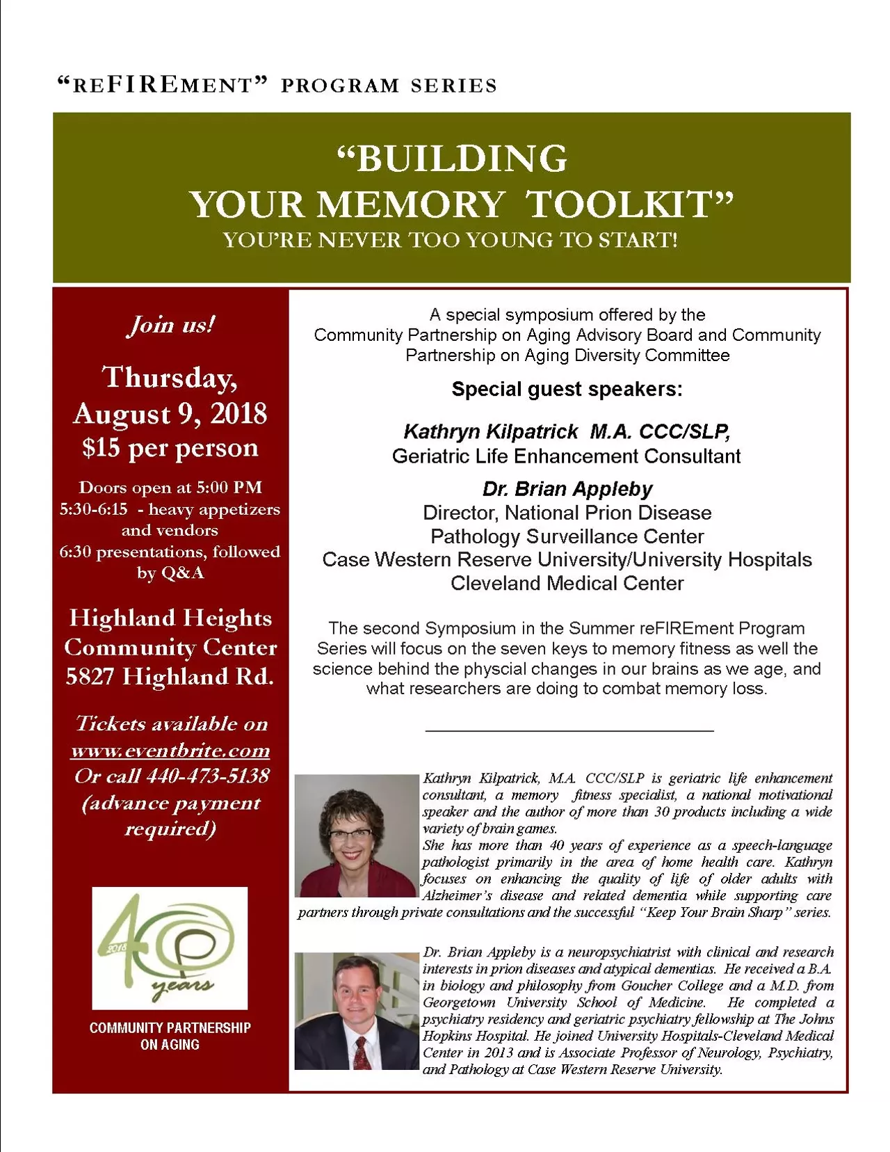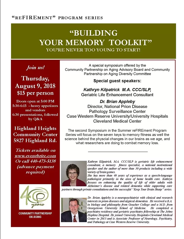 Special guest speakers: Kathryn Kilpatrick, M.A. CCC/SLP , Geriatric Life Enhancement Consultant and Dr. Brian Appleby, Neuropsychiatriast at University Hospitals and Associate Professor of Neurology, Psychiatry, and Pathology at Case Western Reserve University.