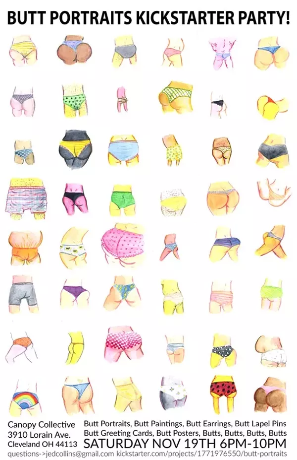 Local artist Jed Collins will be doing live butt portrait sketches and selling all sorts of other cute butt stuff. Some products include handmade, wooden butt earrings and butt lapel pins, butt greeting cards and celebrity butt portraits. The event is for his kickstarter which has almost completed it's goal. There will be live music and other butt friendly activities.