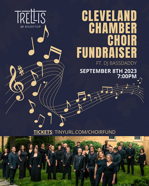 Join the Cleveland Chamber Choir for an evening of music, dancing, and rooftop views! Enjoy live singing, and then dance the night away with special guest DJ BASSDADDY, all while taking in the views from Trellis Rooftop Bar at Studio West 117. This benefit will include delicious food and drink, raffle prizes and more. Kick off our 2023/24 Season and support the future of Cleveland’s finest professional vocal ensemble, and celebrate the naming of our new Artistic Director, Gregory Ristow. Funds raised will also support our continuing partnerships with local youth choirs, arts organizations and charitable organizations.