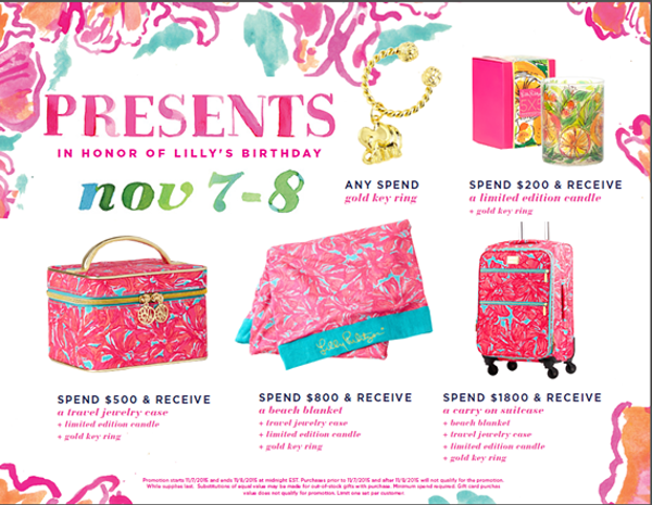 In honor of Lilly Pulitzer’s birthday (Nov. 10th) the brand will be offering shoppers a special gift with purchase promotion in-stores and online, from November 7th – 8th.