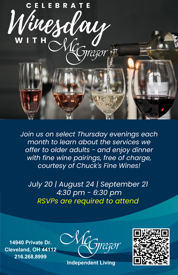 Winesdays will be held from 4:30pm – 6:30pm on July 20, August 24, and September 21. Reservations are required for each event date. Each Winesday will be hosted in the McGregor Independent Living dining room: