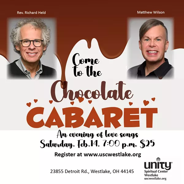 Saturday, February 14, at 7 p.m. Unity Spiritual Center, Westlake, 23855 Detroit Avenue, Westlake, 44145.