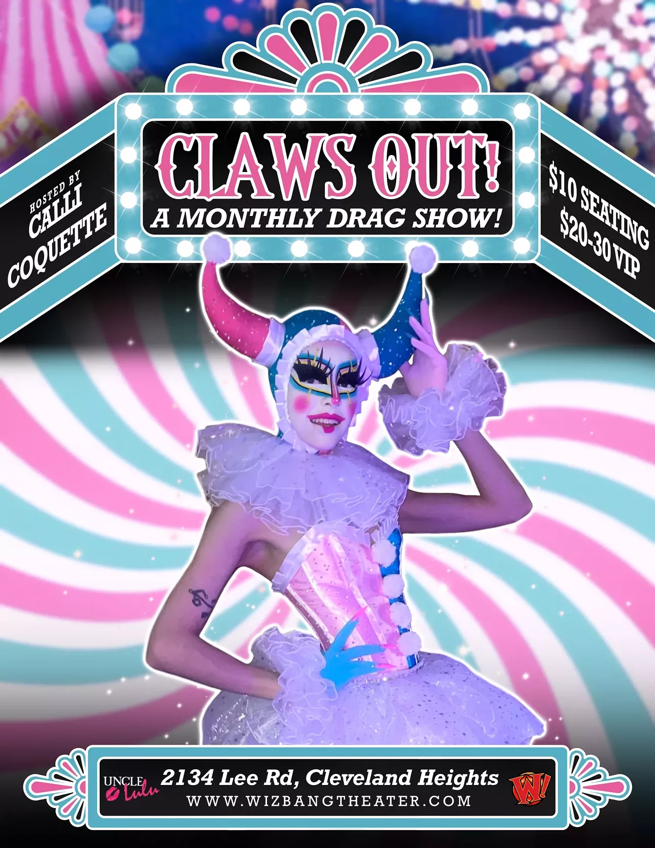Step into a dazzling world of glitter and glamour at Wizbang Theatre, where Uncle Lulu presents a Drag Show like no other, Featuring the mesmerizing "CALLI COQUETTE." Get ready for an evening of fabulous entertainment featuring the finest queens and Kings Cleveland has to offer, with drink specials from the Spirit Room Cocktail Bar, Exclusive, VIP, and general admission tickets are available for an unforgettable night of Dazzling performances and boundless fun.