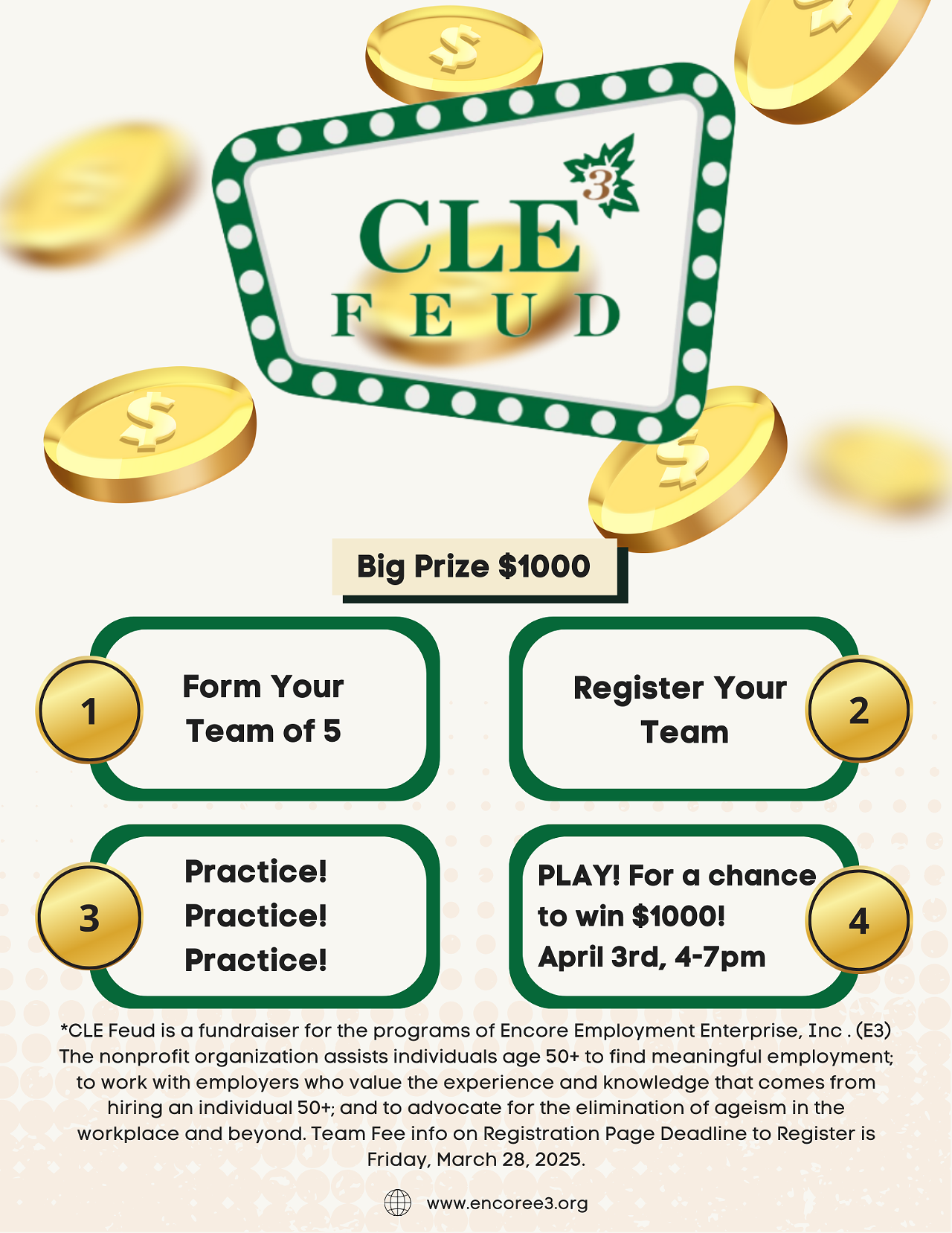 CLE Feud is a community-wide fundraiser that brings us together and raises crucial funds to support E3's services, including our 50+ call center. By raising awareness and securing support from local businesses and individuals, we can continue providing career resources, training, and employment assistance to older workers, ensuring they remain a vital part of the workforce. Your support of this event helps us build a stronger community and workforce where every generation can thrive.
